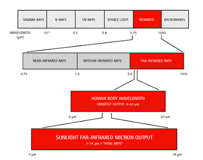 Approximately 80% of solar energy is made up of FIR and 60% is between the range of 10-20 microns. Did you know that our bodies radiate infrared energy out through the skin at 3 - 50 microns, with most of their output at 9.4 microns. Our palms alone emit infrared energy at between 8 - 14 microns. Palm healing, which as a 3,000 year old tradition in China, has been based on the healing properties of these natural infrared rays.